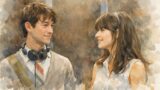 モテキ_映画_カフェでスマホを見ながら微笑む男女の水彩画風イラスト16x9 コメディ